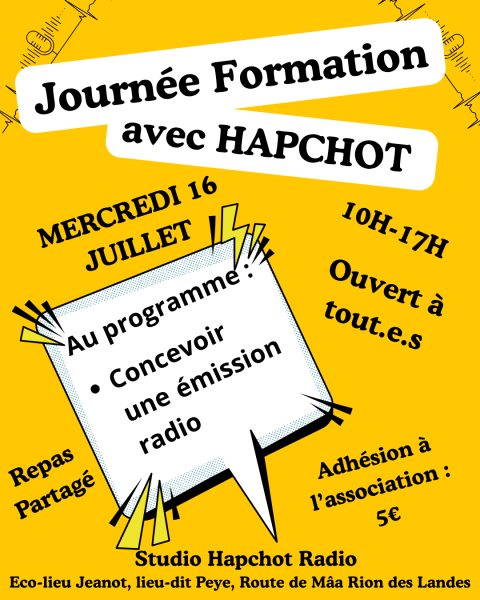Marie et Louis proposent une formation "Concevoir une émission radio" tout au long de la journée. La matinée sera consacrée à des petites formations théoriques sur la technique, l'écriture et l'expression radio, l'après-midi à l'élaboration collective d'une émission de radio.